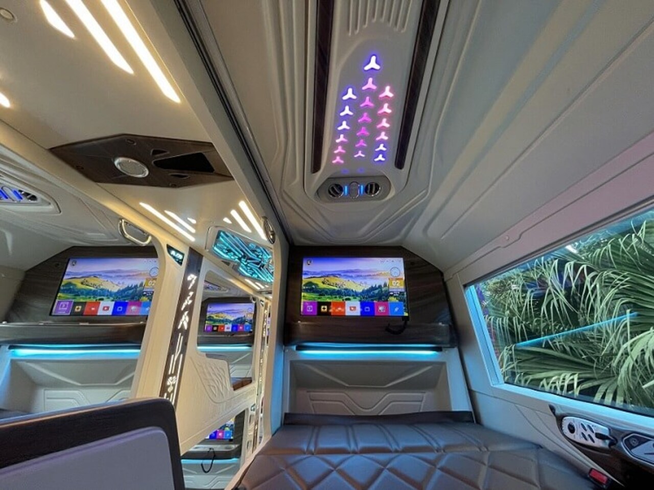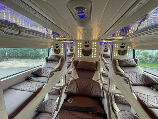 Không gian chung được thiết kế hiện đại với hành lang rộng, trần LED đổi màu và wifi miễn phí toàn xe. Hệ thống điều hòa Denso công suất lớn chạy độc lập giúp duy trì nhiệt độ ổn định trong suốt hành trình.