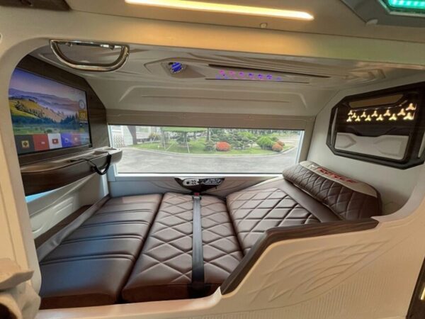 Giường nằm được bọc da cao cấp, có thể điều chỉnh độ nghiêng phù hợp tư thế nghỉ ngơi. Mỗi khoang đều trang bị màn hình giải trí 10 inch hỗ trợ Bluetooth, USB và HDMI, cổng sạc nhanh cho điện thoại và laptop, đèn đọc sách cùng bàn gấp cá nhân. Rèm che riêng giúp hạn chế ánh sáng và tiếng ồn, tạo môi trường nghỉ ngơi yên tĩnh.